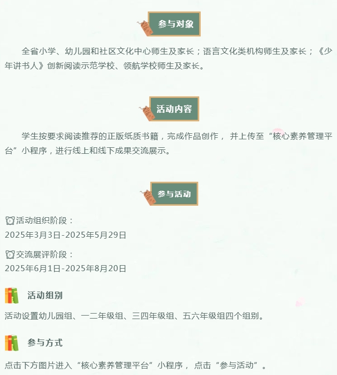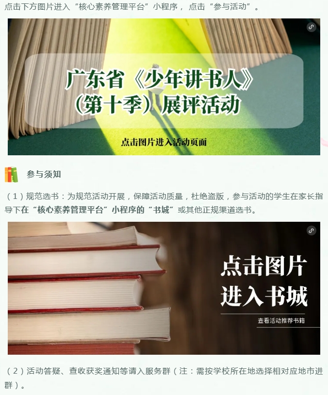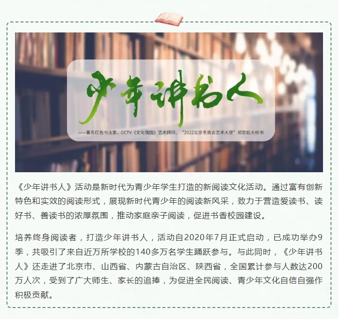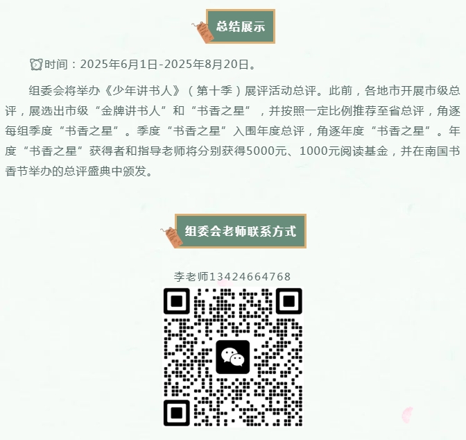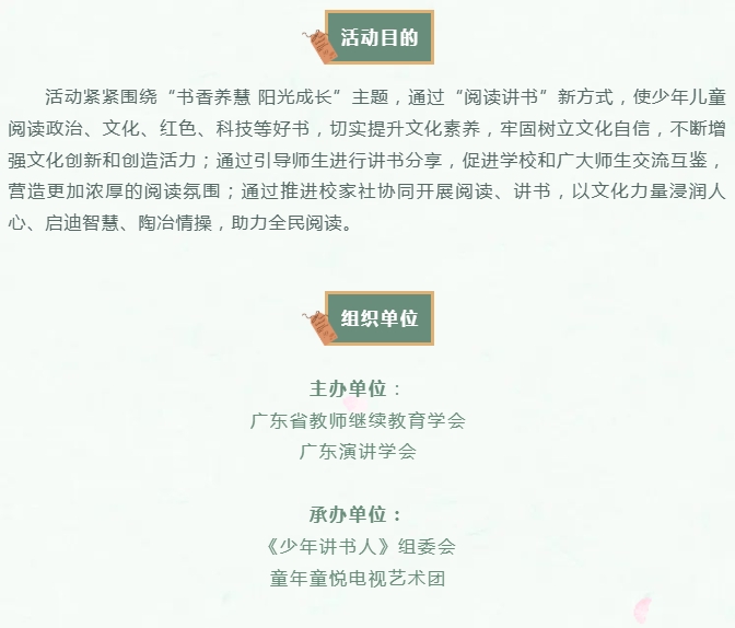为贯彻落实党的二十大关于深化全民阅读活动的重要部署,根据教育部等八部门印发的《全国青少年学生读书行动实施方案》和广东省教育厅等五部门主办的《做新时代文明人·助力“百千万工程”故事会活动》相关要求,结合广东省中小学“书香校园”建设系列活动及南国书香节暨羊城书展工作部署,培育和践行社会主义核心价值观,引导激励少年儿童爱读书、读好书、善读书,推进学校家庭社会协同开展阅读,涵育读书风尚,为培养有理想、有本领、有担当的新时代好少年贡献力量。广东省教师继续教育学会联合广东演讲学会共同举办“书香养慧 阳光成长”广东省《少年讲书人》(第十季)展评活动。