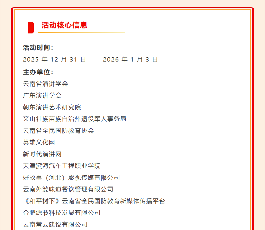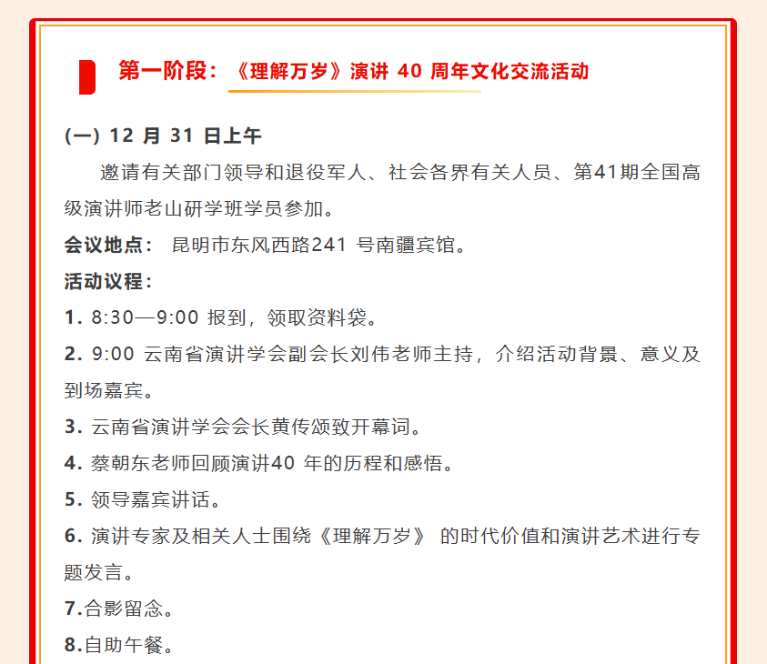 四十年来,蔡朝东的演讲经久不衰,6300 多场,800 多万直接听众,间接听众数以亿计。在网络传播重塑沟通方式、社会多元化呼唤深度理解的当下,演讲作为传递思想、凝聚共识的重要载体,其价值愈发凸显。为进一步传承红色血脉,探索演讲艺术的时代价值和创新发展路径,云南省演讲学会、广东演讲学会等十余家单位共同策划、联合主办本次“《理解万岁》演讲40周年文化交流与老山红色研学活动 ”。